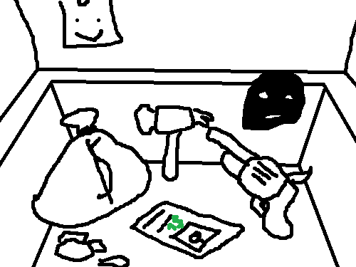 This is what your set is. It includes a revolver, a hammer, a ski mask, a few rocks just because, a bag of cash and the bounty on your head. Wow! You don't look like a criminal at all! Also, you left a sticky note there, incase you ever lose your chest, it's a very valued possession that you don't want anyone having. Now, what do you need that's inside the chest?